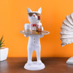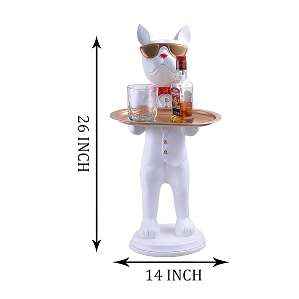 Upgrade your home or bar décor with this elegant 26-inch white French Bulldog butler statue. Designed with a modern aesthetic, this resin sculpture features a stylish bulldog dressed in a tuxedo with gold sunglasses and a red bow tie, holding a golden serving tray. Perfect for serving drinks, snacks, or organizing small essentials, this unique piece is both decorative and functional.
