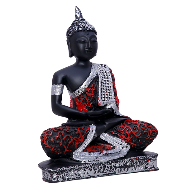 Bring serenity and bold elegance to your space with this black Buddha idol featuring striking red and silver details. Standing 16 cm tall, this finely crafted resin statue is ideal for meditation spaces, festive gifting, or modern décor.