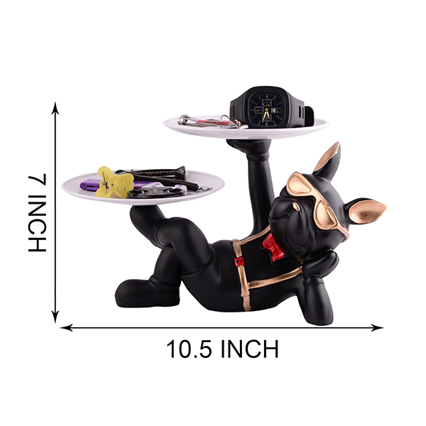 Add a stylish touch to your home with this 10.5-inch French Bulldog Double Tray Holder, featuring a sleek black and gold finish with a red bowtie. This unique resin sculpture showcases a cool bulldog wearing sunglasses while balancing two serving trays—perfect for organizing snacks, jewelry, keys, accessories, or watches. Ideal for modern home décor, office spaces, or as a thoughtful gift for dog lovers and art enthusiasts.